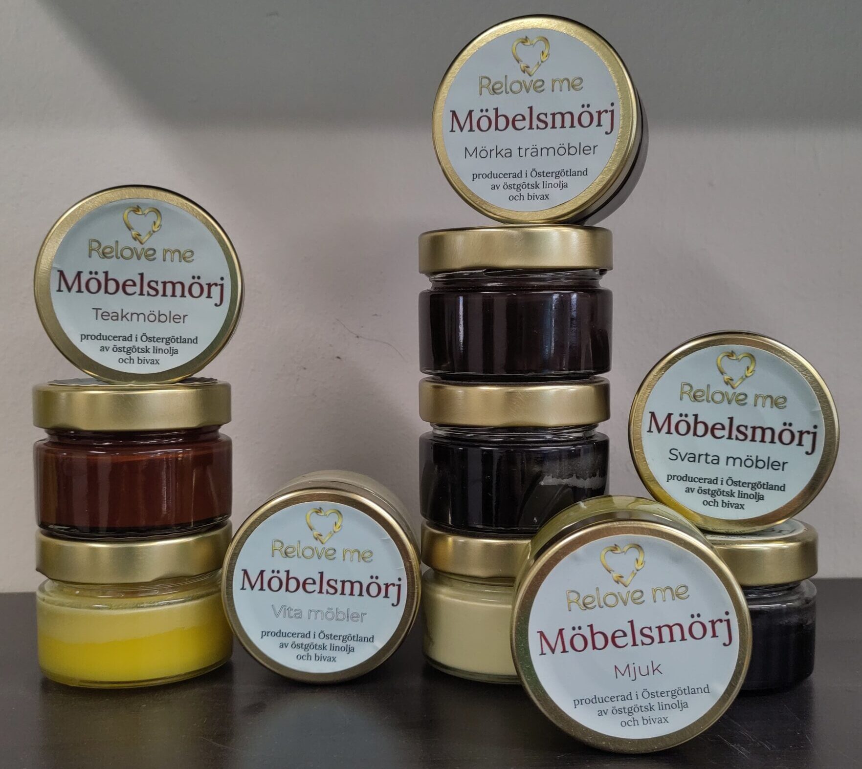 Relove me:s egen möbelsmörj! En produkt som vi producerar själva och som består av 100% svenska linolja och bivax. I vår färgade Möbelsmörj har vi varsamt tillsatt naturliga pigment. Finns i varianterna Mjuk, Lagom, Mörka trämöbler, Vita möbler och Svarta … Continued
